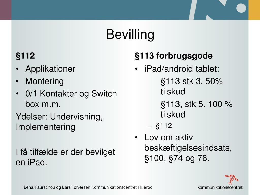 Bevilling §112 §113 forbrugsgode iPad/android tablet: §113 stk 3. 50% tilskud §113, stk 5. 100 % tilskud §112 Lov om aktiv beskæftigelsesindsats, §100, §74 og 76. • Applikationer • Montering • 0/1 Kontakter og Switch box m.m. Ydelser: Undervisning, Implementering I få tilfælde er der bevilget en iPad.