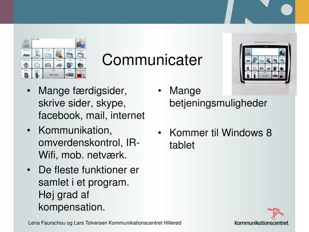 Communicater • Mange færdigsider, skrive sider, skype, facebook, mail, internet • Kommunikation, omverdenskontrol, IR-Wifi, mob. netværk. • De fleste funktioner er samlet i et program. Høj grad af kompensation. • Mange betjeningsmuligheder • Kommer til Windows 8 tablet