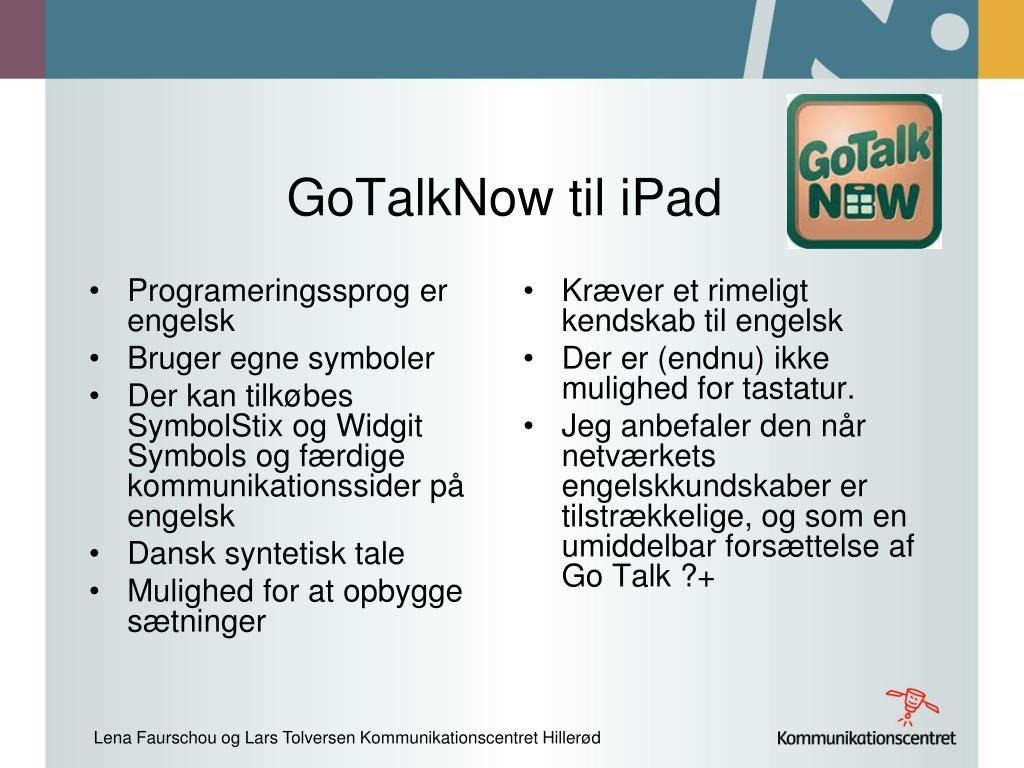 GoTalkNow til iPad • Programeringssprog er engelsk • Bruger egne symboler • Der kan tilkøbes SymbolStix og Widgit Symbols og færdige kommunikationssider på engelsk • Dansk syntetisk tale • Mulighed for at opbygge sætninger • Kræver et rimeligt kendskab til engelsk • Der er (endnu) ikke mulighed for tastatur. • Jeg anbefaler den når netværkets engelskkundskaber er tilstrækkelige, og som en umiddelbar forsættelse af Go Talk ?+