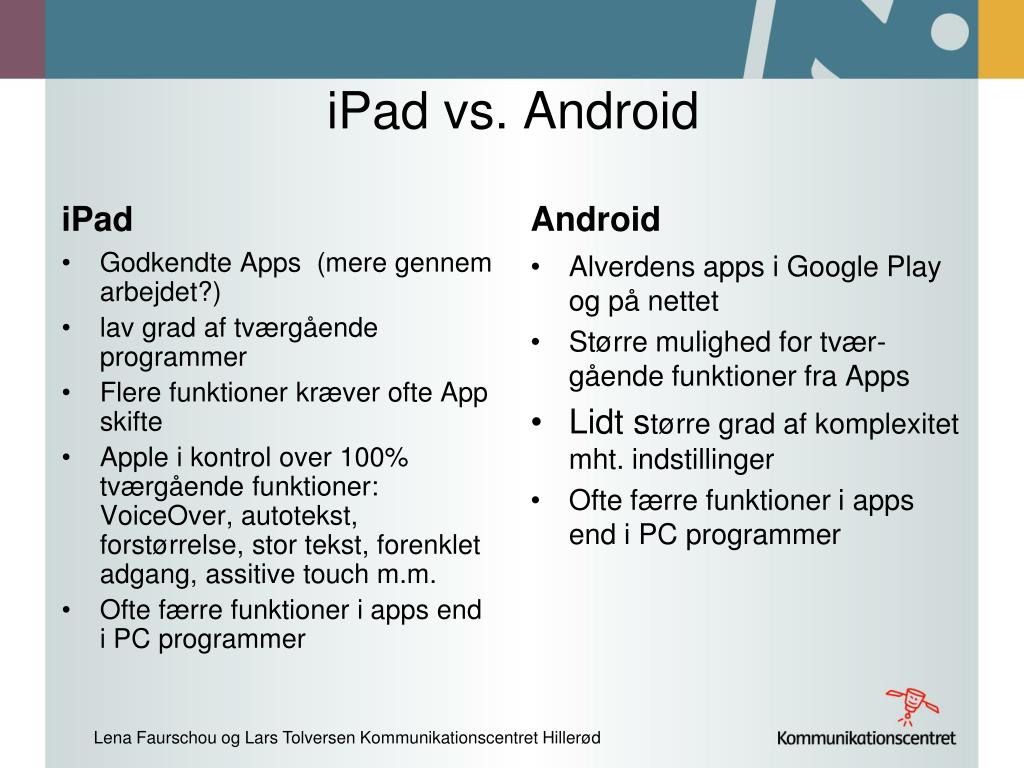 iPad vs. Android iPad Android Alverdens apps i Google Play og på nettet Større mulighed for tvær-gående funktioner fra Apps Lidt større grad af komplexitet mht. indstillinger Ofte færre funktioner i apps end i PC programmer • Godkendte Apps (mere gennem arbejdet?) • lav grad af tværgående programmer • Flere funktioner kræver ofte App skifte • Apple i kontrol over 100% tværgående funktioner: VoiceOver, autotekst, forstørrelse, stor tekst, forenklet adgang, assitive touch m.m. • Ofte færre funktioner i apps end i PC programmer