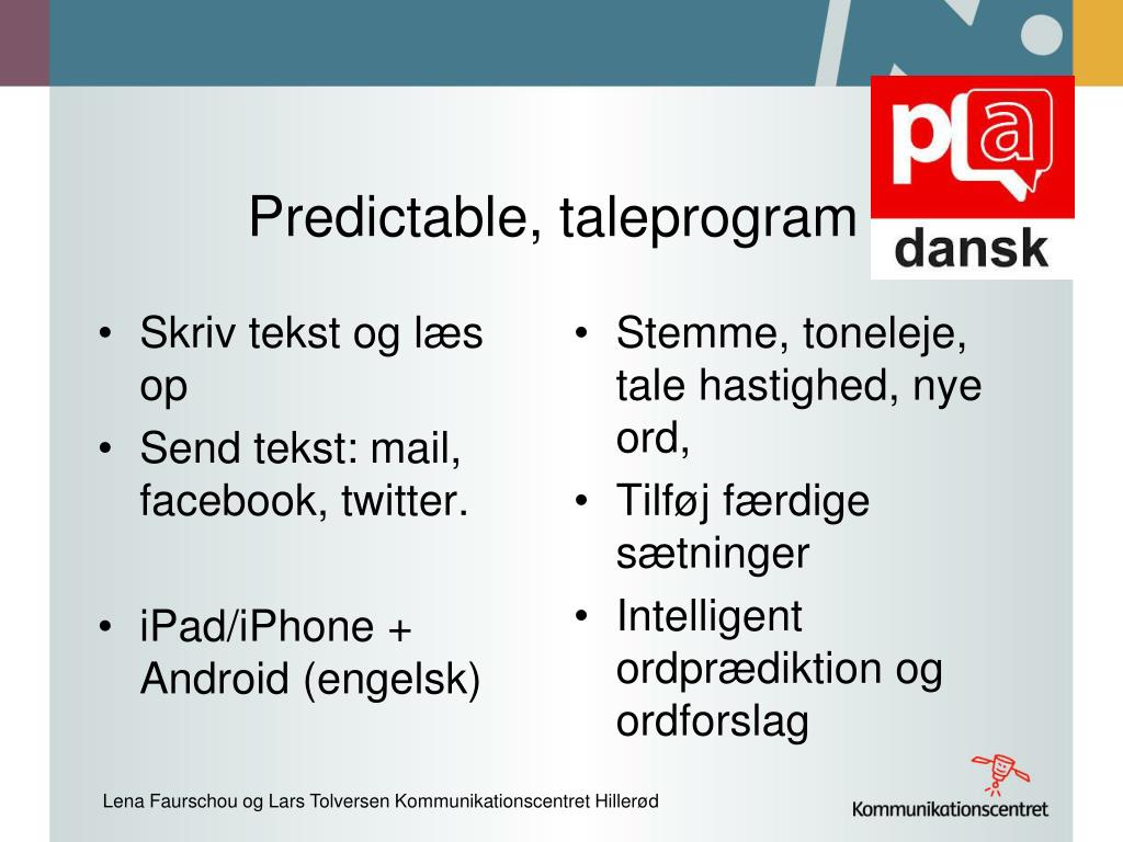 Predictable, taleprogram • Skriv tekst og læs op • Send tekst: mail, facebook, twitter. • iPad/iPhone + Android (engelsk) • Stemme, toneleje, tale hastighed, nye ord, • Tilføj færdige sætninger • Intelligent ordprædiktion og ordforslag