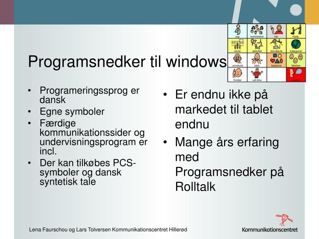 Programsnedker til windows • Programeringssprog er dansk • Egne symboler • Færdige kommunikationssider og undervisningsprogram er incl. • Der kan tilkøbes PCS-symboler og dansk syntetisk tale • Er endnu ikke på markedet til tablet endnu • Mange års erfaring med Programsnedker på Rolltalk
