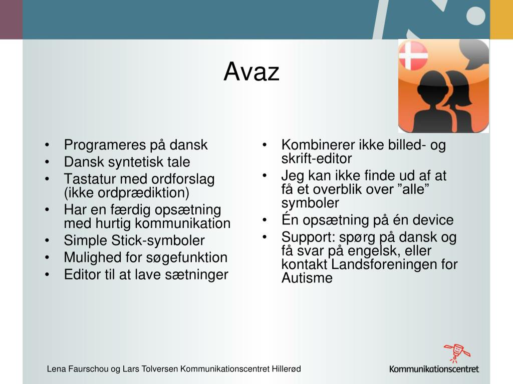 Avaz • Programeres på dansk • Dansk syntetisk tale • Tastatur med ordforslag (ikke ordprædiktion) • Har en færdig opsætning med hurtig kommunikation • Simple Stick-symboler • Mulighed for søgefunktion • Editor til at lave sætninger • Kombinerer ikke billed- og skrift-editor • Jeg kan ikke finde ud af at få et overblik over ”alle” symboler • Én opsætning på én device • Support: spørg på dansk og få svar på engelsk, eller kontakt Landsforeningen for Autisme