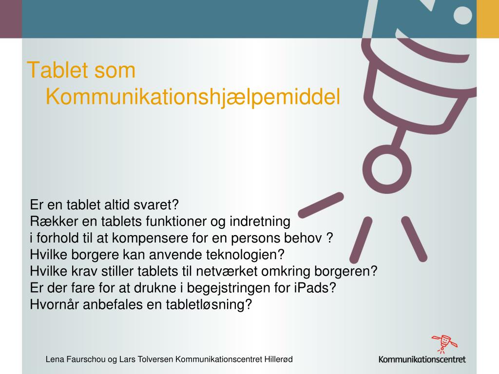 Tablet som Kommunikationshjælpemiddel Er en tablet altid svaret? Rækker en tablets funktioner og indretning i forhold til at kompensere for en persons behov ? Hvilke borgere kan anvende teknologien? Hvilke krav stiller tablets til netværket omkring borgeren? Er der fare for at drukne i begejstringen for iPads? Hvornår anbefales en tabletløsning?