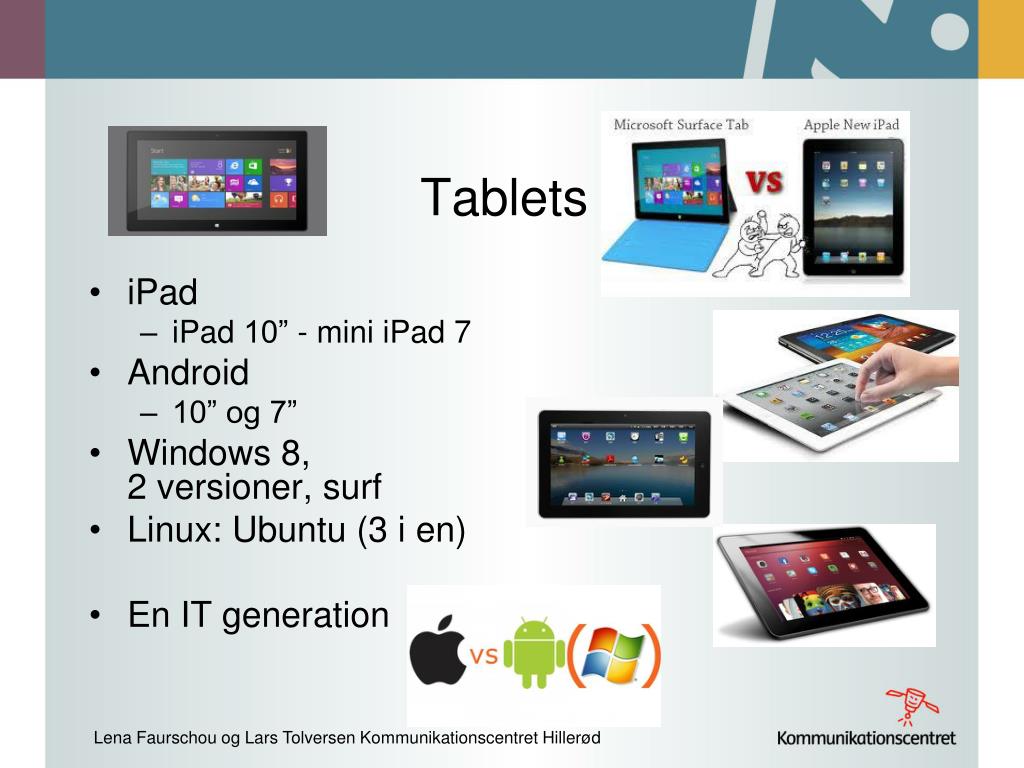 Tablets • iPad • iPad 10” - mini iPad 7 • Android • 10” og 7” • Windows 8, 2 versioner, surf • Linux: Ubuntu (3 i en) • En IT generation