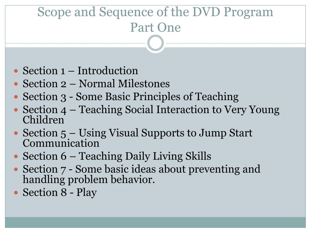 Scope and Sequence of the DVD ProgramPart One Section 1 – Introduction Section 2 – Normal Milestones Section 3 - Some Basic Principles of Teaching Section 4 – Teaching Social Interaction to Very Young Children Section 5 – Using Visual Supports to Jump Start Communication Section 6 – Teaching Daily Living Skills Section 7 - Some basic ideas about preventing and handling problem behavior. Section 8 - Play