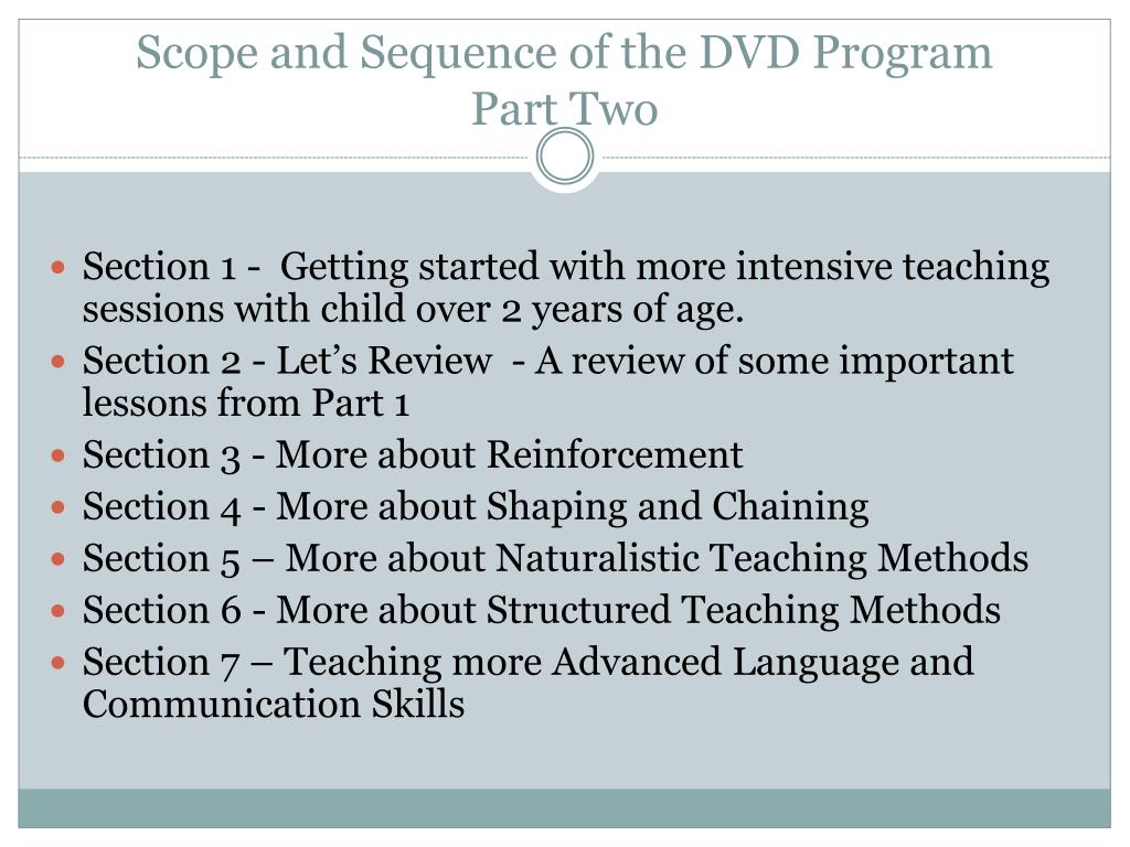 Scope and Sequence of the DVD ProgramPart Two Section 1 - Getting started with more intensive teaching sessions with child over 2 years of age. Section 2 - Let’s Review - A review of some important lessons from Part 1 Section 3 - More about Reinforcement Section 4 - More about Shaping and Chaining Section 5 – More about Naturalistic Teaching Methods Section 6 - More about Structured Teaching Methods Section 7 – Teaching more Advanced Language and Communication Skills