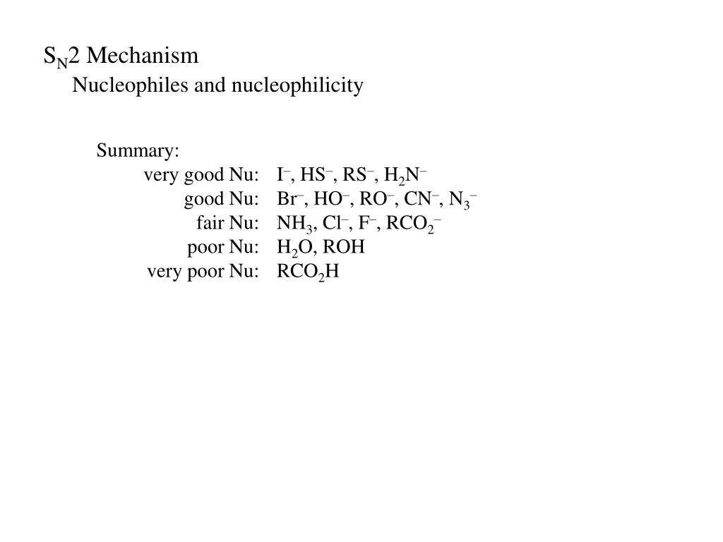 SN2 Mechanism Nucleophiles and nucleophilicity Summary: very good Nu: I–, HS–, RS–, H2N– good Nu: Br–, HO–, RO–, CN–, N3– fair Nu: NH3, Cl–, F–, RCO2– poor Nu: H2O, ROH very poor Nu: RCO2H
