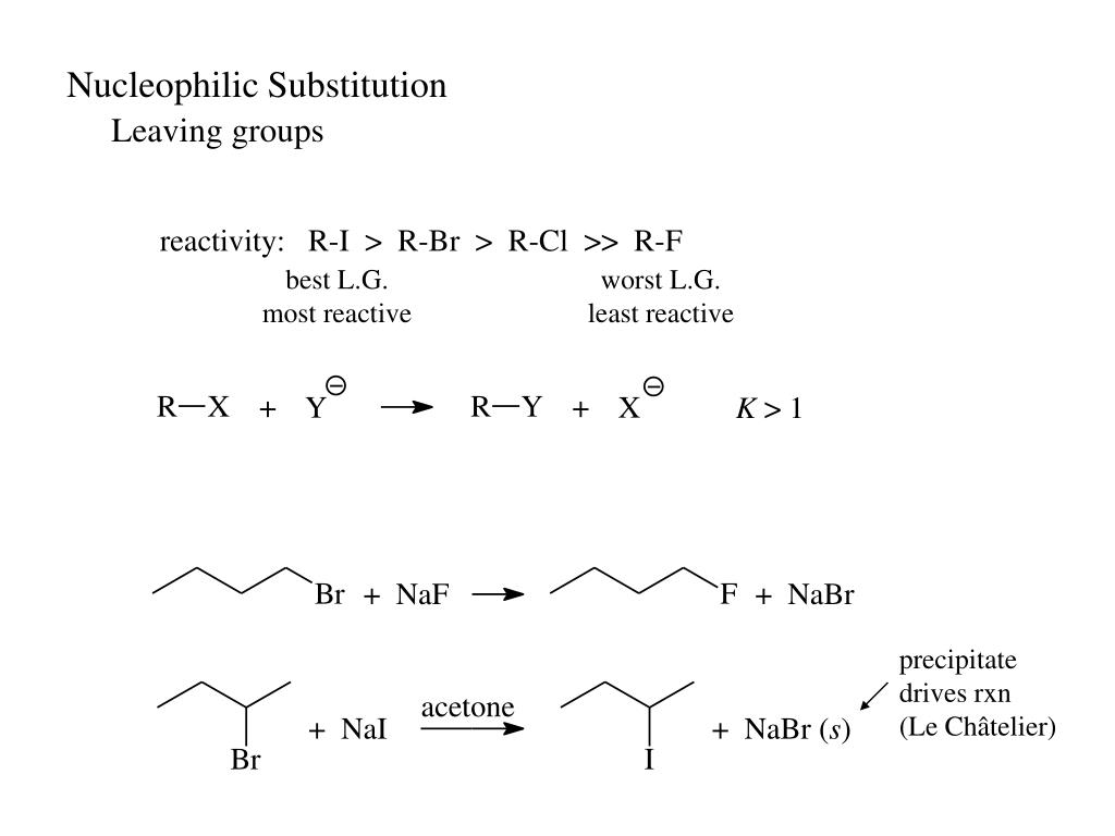 Nucleophilic Substitution Leaving groups reactivity: R-I > R-Br > R-Cl >> R-F best L.G. most reactive worst L.G. least reactive precipitate drives rxn (Le Châtelier)