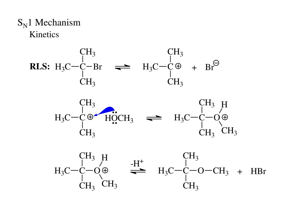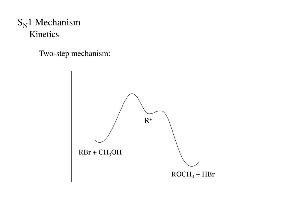 SN1 Mechanism Kinetics Two-step mechanism: R+ RBr + CH3OH ROCH3 + HBr