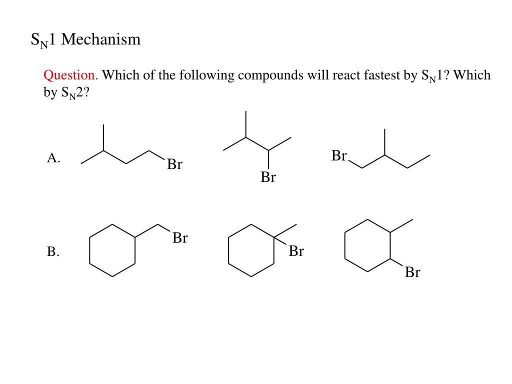 SN1 Mechanism Question. Which of the following compounds will react fastest by SN1? Which by SN2? A. B.