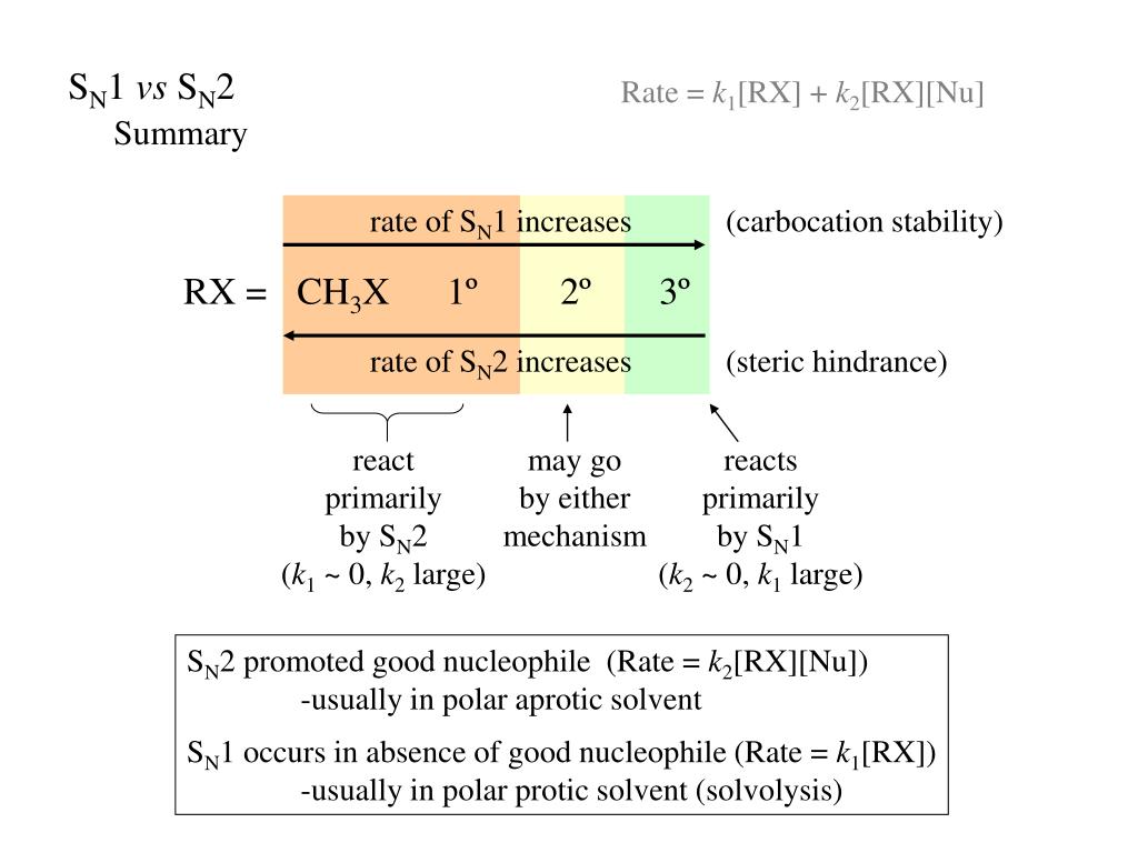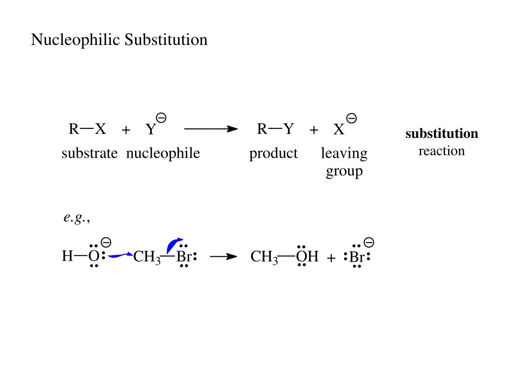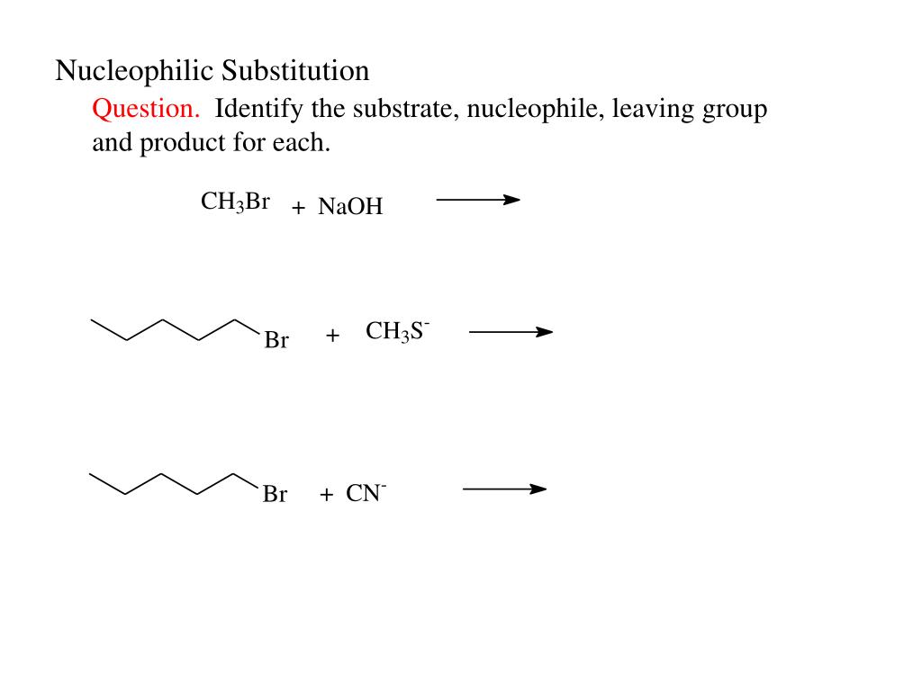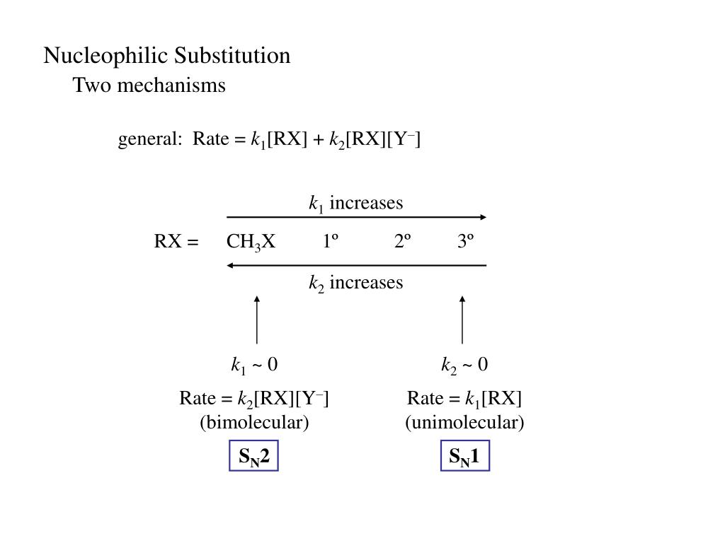 A little organic chemistry. Nucleophilic Substitution. substitution reaction. Nucleophilic Substitution. Question. Identify the substrate, nucleophile, leaving group and product for each. Nucleophilic Substitution. Two mechanisms. general: Rate = k 1 [RX] + k 2 [RX][Y – ].