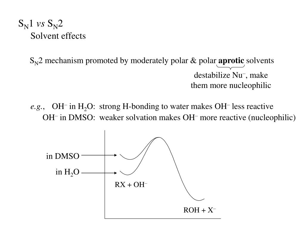 SN1 vs SN2 Solvent effects SN2 mechanism promoted by moderately polar & polar aprotic solvents destabilize Nu–, make them more nucleophilic e.g., OH– in H2O: strong H-bonding to water makes OH– less reactive OH– in DMSO: weaker solvation makes OH– more reactive (nucleophilic) in DMSO in H2O RX + OH– ROH + X–