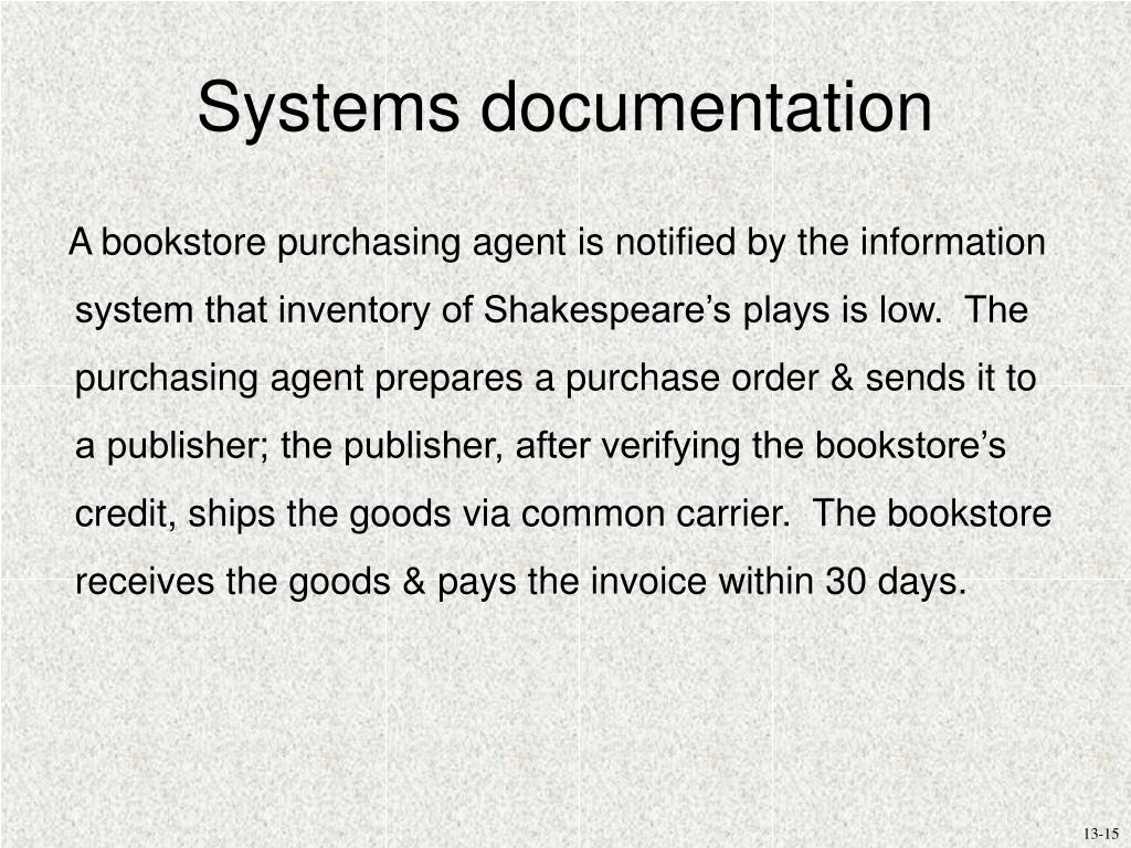Systems documentation A bookstore purchasing agent is notified by the information system that inventory of Shakespeare’s plays is low. The purchasing agent prepares a purchase order & sends it to a publisher; the publisher, after verifying the bookstore’s credit, ships the goods via common carrier. The bookstore receives the goods & pays the invoice within 30 days.