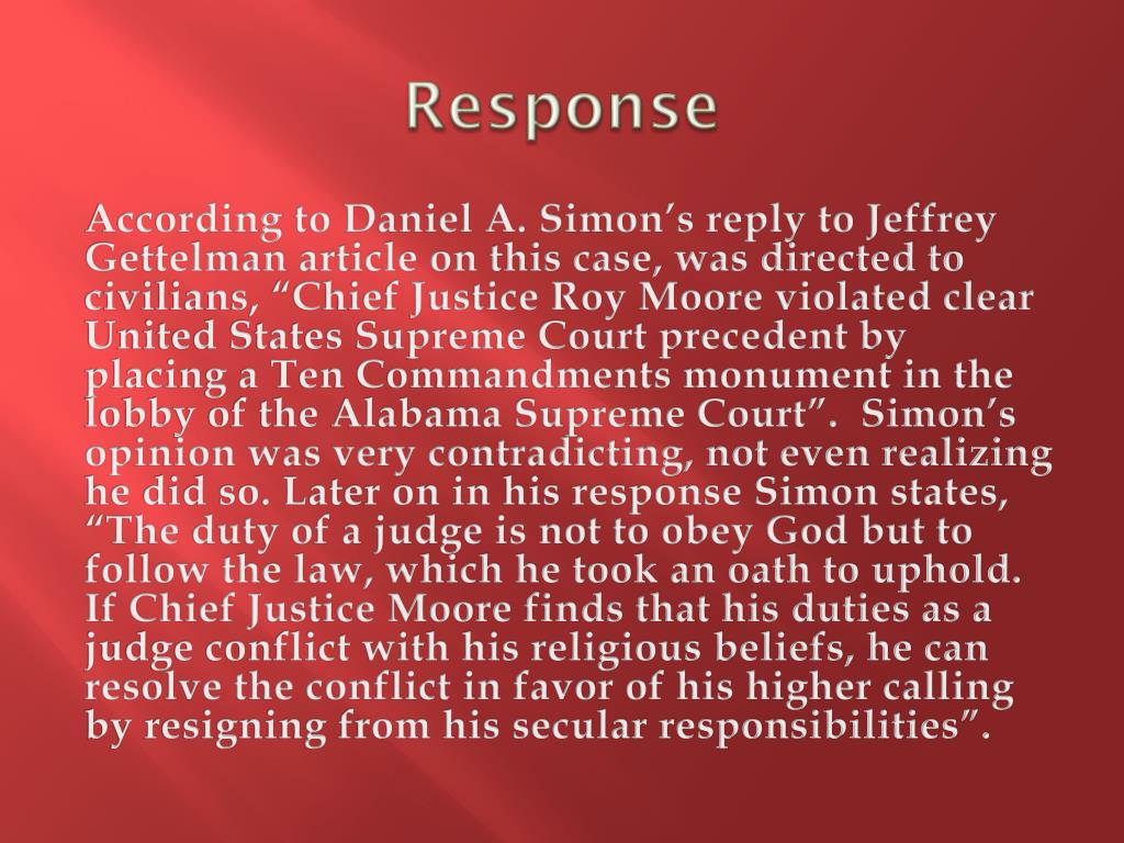 Response According to Daniel A. Simon’s reply to Jeffrey Gettelman article on this case, was directed to civilians, “Chief Justice Roy Moore violated clear United States Supreme Court precedent by placing a Ten Commandments monument in the lobby of the Alabama Supreme Court”. Simon’s opinion was very contradicting, not even realizing he did so. Later on in his response Simon states, “The duty of a judge is not to obey God but to follow the law, which he took an oath to uphold. If Chief Justice Moore finds that his duties as a judge conflict with his religious beliefs, he can resolve the conflict in favor of his higher calling by resigning from his secular responsibilities”.