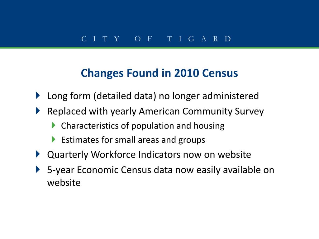 Changes Found in 2010 Census Long form (detailed data) no longer administered Replaced with yearly American Community Survey • Characteristics of population and housing • Estimates for small areas and groups Quarterly Workforce Indicators now on website 5-year Economic Census data now easily available on website