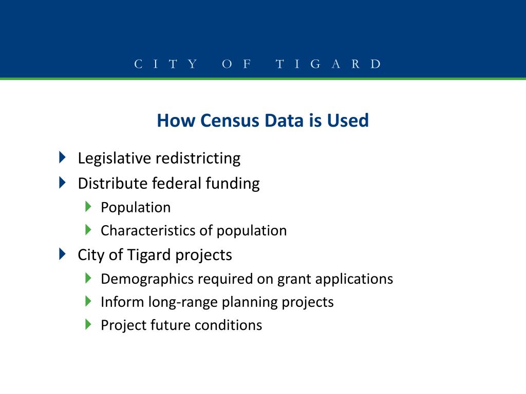 How Census Data is Used Legislative redistricting Distribute federal funding • Population • Characteristics of population City of Tigard projects • Demographics required on grant applications • Inform long-range planning projects • Project future conditions
