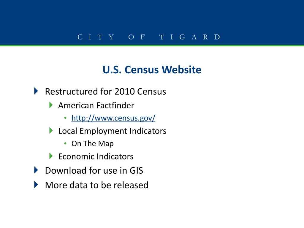 U.S. Census Website Restructured for 2010 Census • American Factfinder • http://www.census.gov/ • Local Employment Indicators • On The Map • Economic Indicators Download for use in GIS More data to be released
