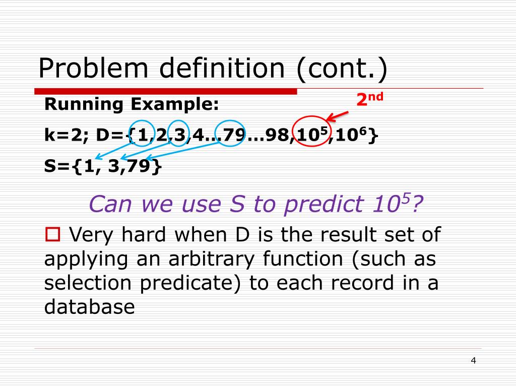 Problem definition (cont.) 2nd • Running Example: • k=2; D={1,2,3,4…79…98,105,106} • S={1, 3,79} • Can we use S to predict 105? • Very hard when D is the result set of applying an arbitrary function (such as selection predicate) to each record in a database