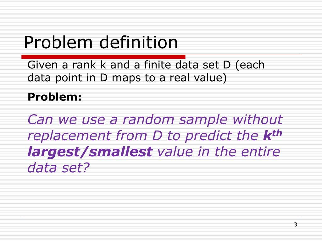 Problem definition Given a rank k and a finite data set D (each data point in D maps to a real value) Problem: Can we use a random sample without replacement from D to predict the kth largest/smallest value in the entire data set?