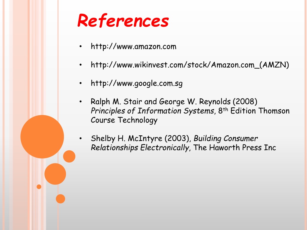 http://www.amazon.com • http://www.wikinvest.com/stock/Amazon.com_(AMZN) • http://www.google.com.sg • Ralph M. Stair and George W. Reynolds (2008) Principles of Information Systems, 8th Edition Thomson Course Technology • Shelby H. McIntyre (2003), Building Consumer Relationships Electronically, The Haworth Press Inc References