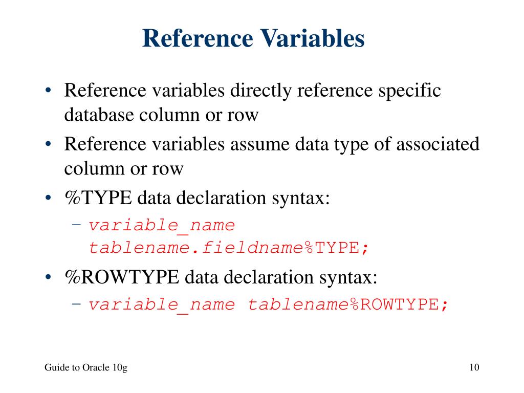 Reference Variables • The (%TYPE) reference data type specifies a variable that references a single DB field. • current_f_last FACULTY.F_LAST%TYPE; • The current_f_last variable assumes a data type of VARCHAR2(30), because this is the data type of the f_last column in the FACULTY table. Guide to Oracle 10g