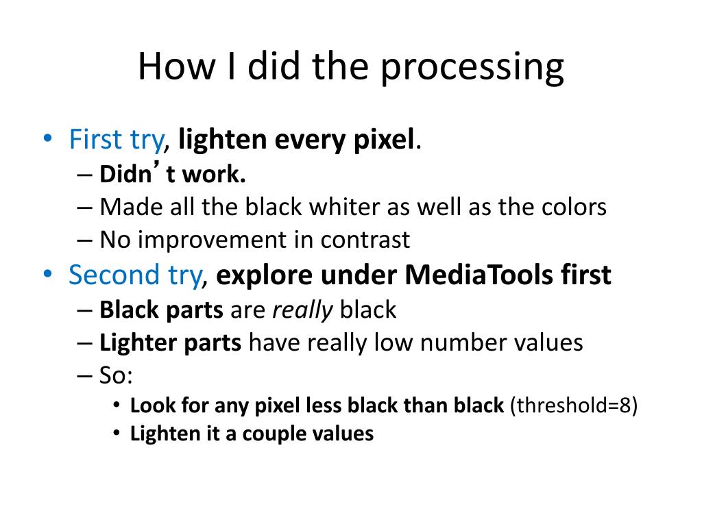 How I did the processing • First try, lighten every pixel. • Didn’t work. • Made all the black whiter as well as the colors • No improvement in contrast • Second try, explore under MediaTools first • Black parts are really black • Lighter parts have really low number values • So: • Look for any pixel less black than black (threshold=8) • Lighten it a couple values