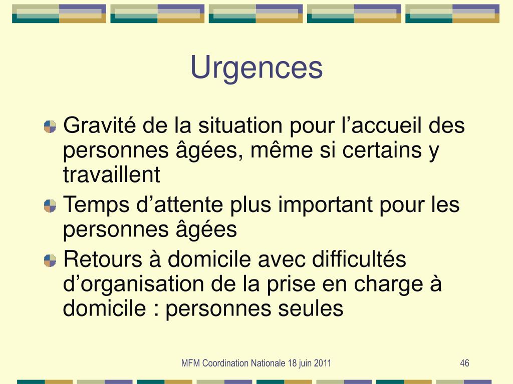 Urgences • Gravité de la situation pour l’accueil des personnes âgées, même si certains y travaillent • Temps d’attente plus important pour les personnes âgées • Retours à domicile avec difficultés d’organisation de la prise en charge à domicile : personnes seules MFM Coordination Nationale 18 juin 2011