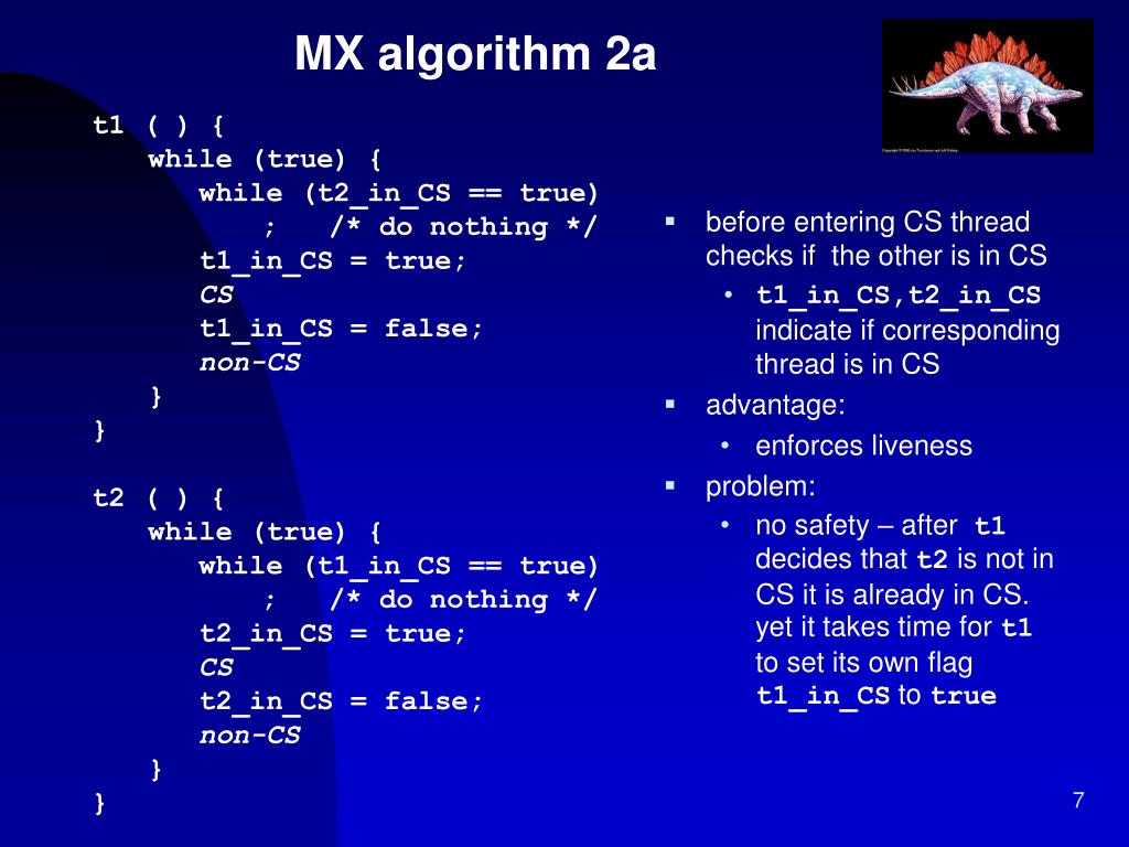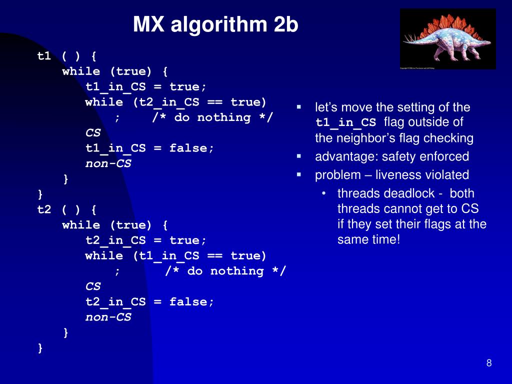 MX algorithm 2a • t1 ( ) { • while (true) { • while (t2_in_CS == true) • ; /* do nothing */ • t1_in_CS = true; • CS • t1_in_CS = false; • non-CS • } • } • t2 ( ) { • while (true) { • while (t1_in_CS == true) • ; /* do nothing */ • t2_in_CS = true; • CS • t2_in_CS = false; • non-CS • } • } • before entering CS thread checks if the other is in CS • t1_in_CS,t2_in_CS indicate if corresponding thread is in CS • advantage: • enforces liveness • problem: • no safety – after t1 decides that t2 is not in CS it is already in CS. yet it takes time for t1 to set its own flag t1_in_CS to true