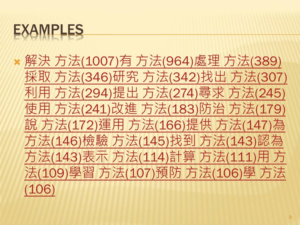 治療 方法(832)唯一 方法(306)使用 方法(251)管理 方法(197)和平 方法(120)調查 方法(92)手術 方法(90)傳統 方法(89)交易 方法(88)統計 方法(81)教育 方法(73)分析 方法(71)訓練 方法(68)測試 方法(63)製造 方法(55) Noun +NOUn