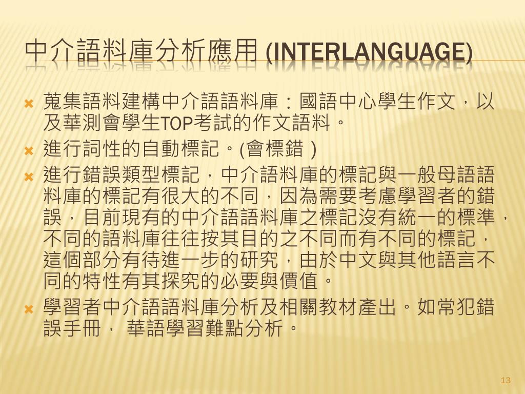 蒐集語料建構中介語語料庫:國語中心學生作文,以及華測會學生TOP考試的作文語料。蒐集語料建構中介語語料庫:國語中心學生作文,以及華測會學生TOP考試的作文語料。 進行詞性的自動標記。(會標錯) 進行錯誤類型標記,中介語料庫的標記與一般母語語料庫的標記有很大的不同,因為需要考慮學習者的錯誤,目前現有的中介語語料庫之標記沒有統一的標準,不同的語料庫往往按其目的之不同而有不同的標記,這個部分有待進一步的研究,由於中文與其他語言不同的特性有其探究的必要與價值。 學習者中介語語料庫分析及相關教材產出。如常犯錯誤手冊, 華語學習難點分析。 中介語料庫分析應用 (InterLanguage)