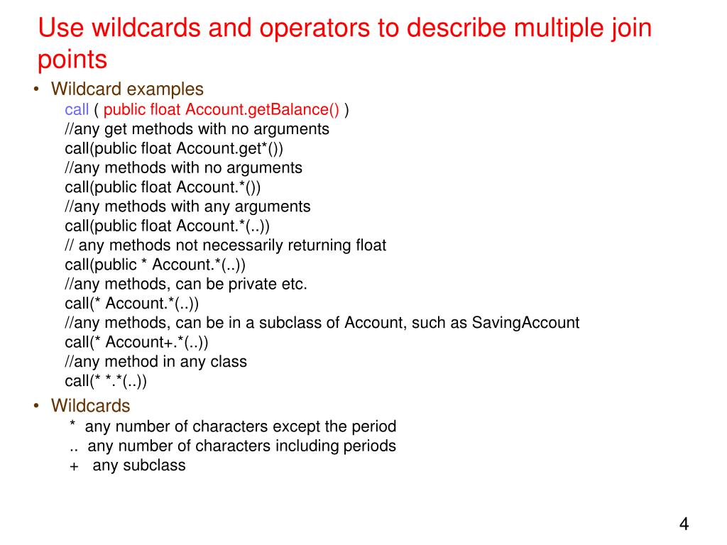 Use wildcards and operators to describe multiple join points • Wildcard examples call ( public float Account.getBalance() ) //any get methods with no arguments call(public float Account.get*()) //any methods with no arguments call(public float Account.*()) //any methods with any arguments call(public float Account.*(..)) // any methods not necessarily returning float call(public * Account.*(..)) //any methods, can be private etc. call(* Account.*(..)) //any methods, can be in a subclass of Account, such as SavingAccount call(* Account+.*(..)) //any method in any class call(* *.*(..)) • Wildcards * any number of characters except the period .. any number of characters including periods + any subclass