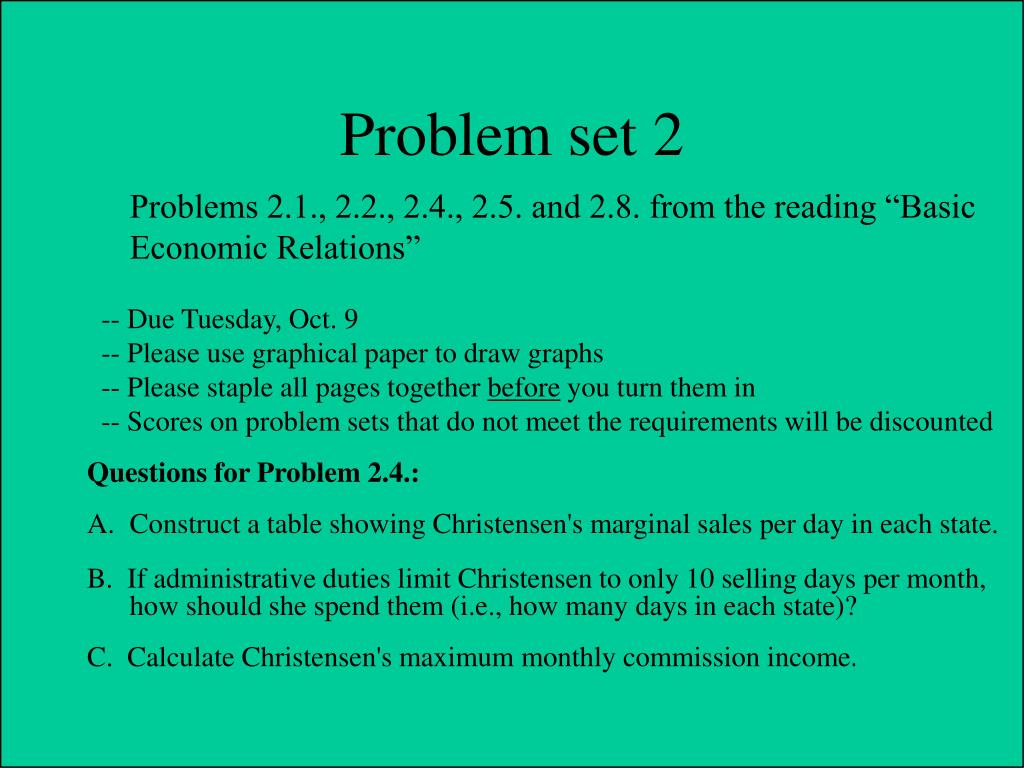 Problems 2.1., 2.2., 2.4., 2.5. and 2.8. from the reading “Basic Economic Relations” -- Due Tuesday, Oct. 9 -- Please use graphical paper to draw graphs --Please staple all pages together before you turn them in -- Scores on problem sets that do not meet the requirements will be discounted Questions for Problem 2.4.: Construct a table showing Christensen's marginal sales per day in each state. B. If administrative duties limit Christensen to only 10 selling days per month, how should she spend them (i.e., how many days in each state)? C. Calculate Christensen's maximum monthly commission income. Problem set 2