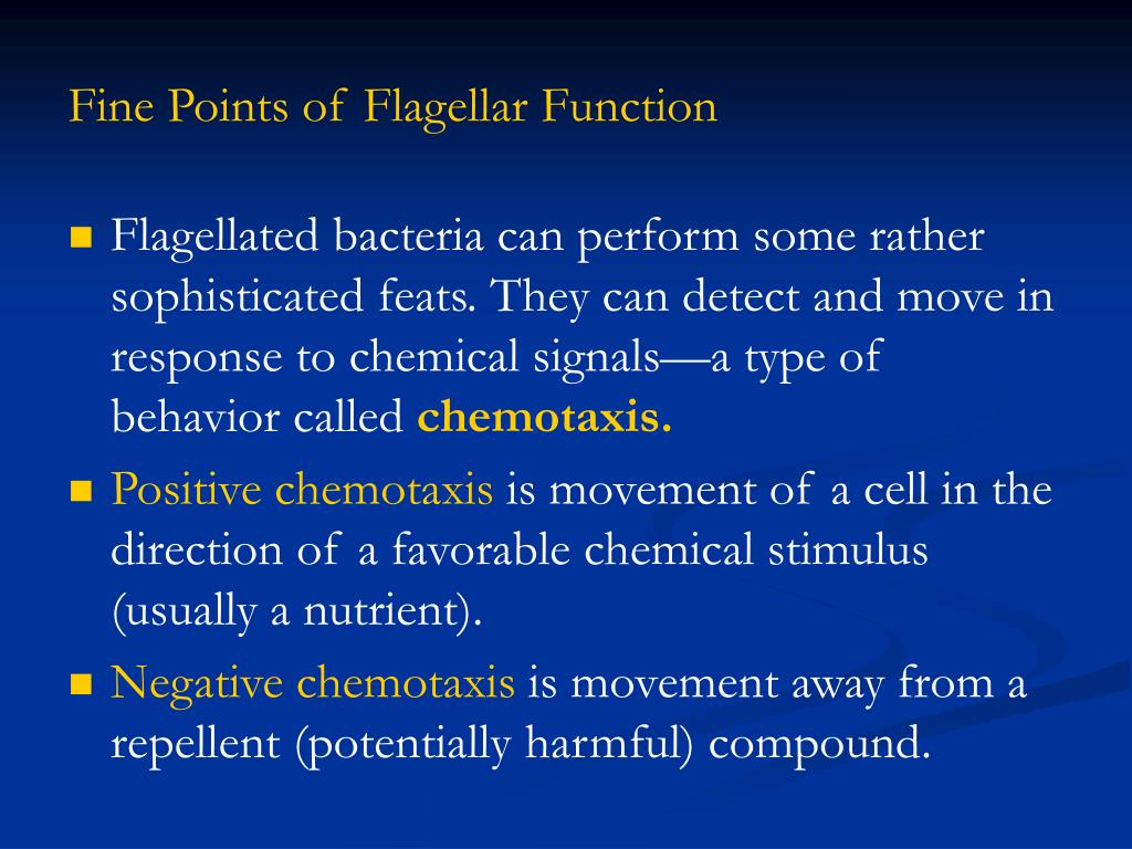 Fine Points of Flagellar Function • Flagellated bacteria can perform some rather sophisticated feats. They can detect and move in response to chemical signals—a type of behavior called chemotaxis. • Positive chemotaxis is movement of a cell in the direction of a favorable chemical stimulus (usually a nutrient). • Negative chemotaxis is movement away from a repellent (potentially harmful) compound.