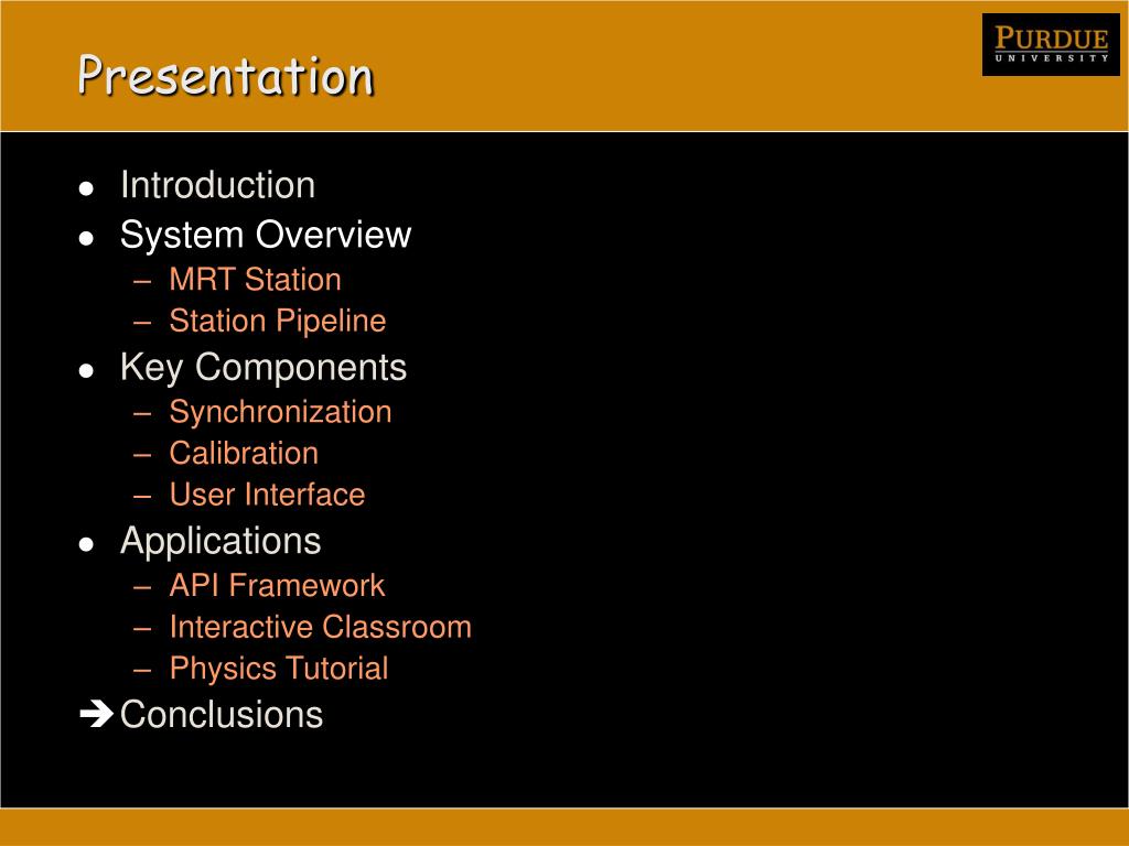Presentation • Introduction • System Overview • MRT Station • Station Pipeline • Key Components • Synchronization • Calibration • User Interface • Applications • API Framework • Interactive Classroom • Interactive Physics • Conclusions
