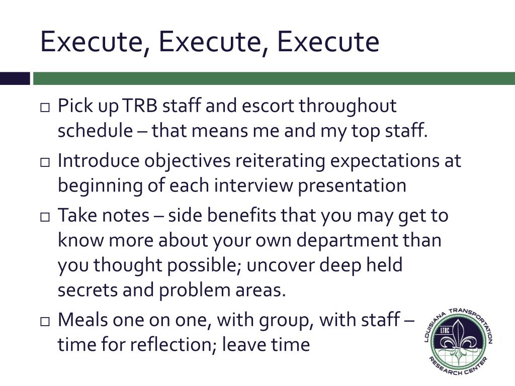 Execute, Execute, Execute • Pick up TRB staff and escort throughout schedule – that means me and my top staff. • Introduce objectives reiterating expectations at beginning of each interview presentation • Take notes – side benefits that you may get to know more about your own department than you thought possible; uncover deep held secrets and problem areas. • Meals one on one, with group, with staff – good time for reflection; leave time