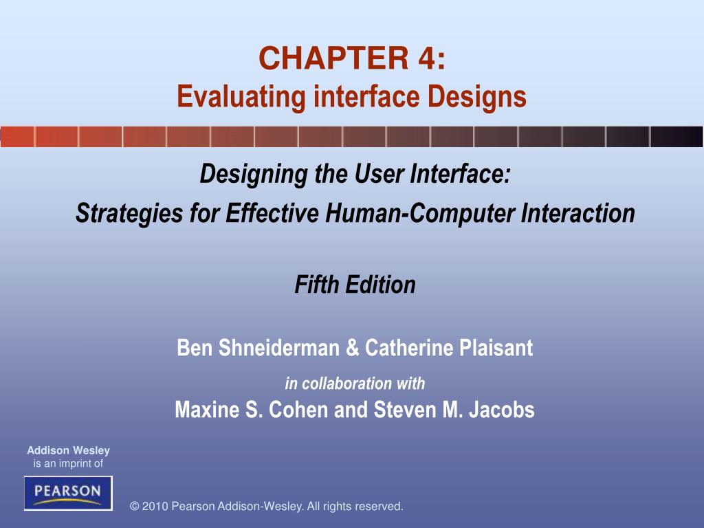 Designing the User Interface: Strategies for Effective Human-Computer Interaction Fifth Edition Ben Shneiderman & Catherine Plaisant in collaboration withMaxine S. Cohen and Steven M. Jacobs CHAPTER 4:Evaluating interface Designs