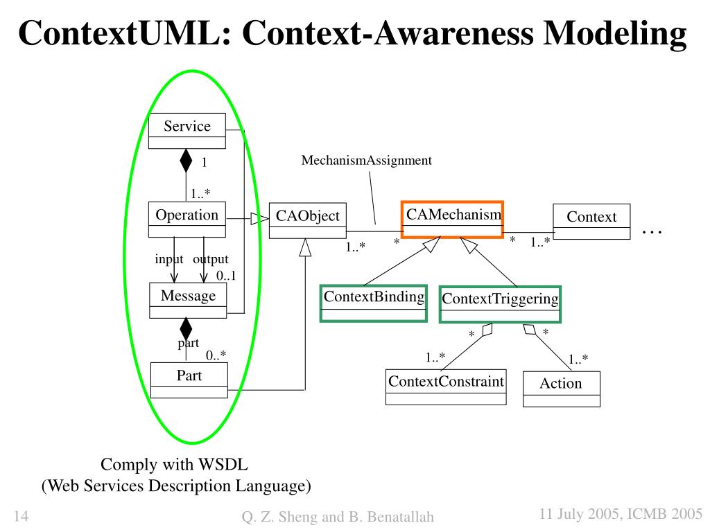 ContextUML: Context Modeling (cont.)Context Service Community • The selection can be based on a set of Quality of Context (QoC) parameters • Precision: accuracy of context information (e.g., 10°C ±0.2 ) • RefreshRate: update rate (e.g., every 30 seconds) • TrustWorthiness: how likely a context is correct. (e.g., good) • ….. • QoC parameters are crucial to CASs. Imperfection of context information may make CASs misguide users • Attractions searching service might suggest a user to surf at Bondi Beach, although it is rainy and stormy!!! 11 July 2005, ICMB 2005 12 Q. Z. Sheng and B. Benatallah