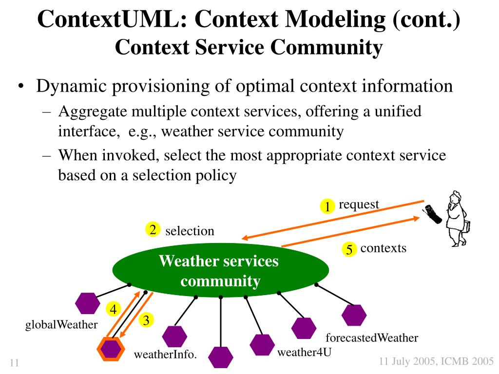 Sydney (12/07/05)Temperature: 11°C-17 °C Rainlikelihood: 40% Global Weather Service, http://www.capescience.com/webservices/globalweather ContextUML: Context Modeling (cont.) • Context source models the resources from which contexts are retrieved • Two types context sources: context service and context service community • Context service: collect, refine, and disseminate context 11 July 2005, ICMB 2005 10