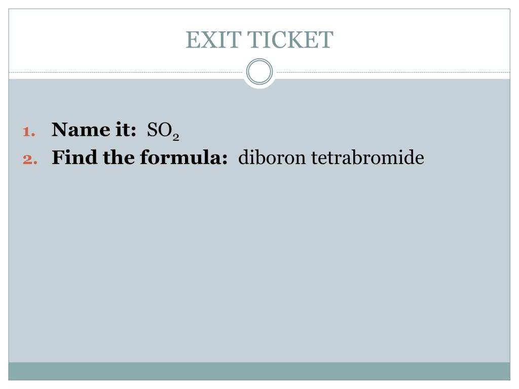 EXIT TICKET Name it: SO2 Find the formula: diborontetrabromide