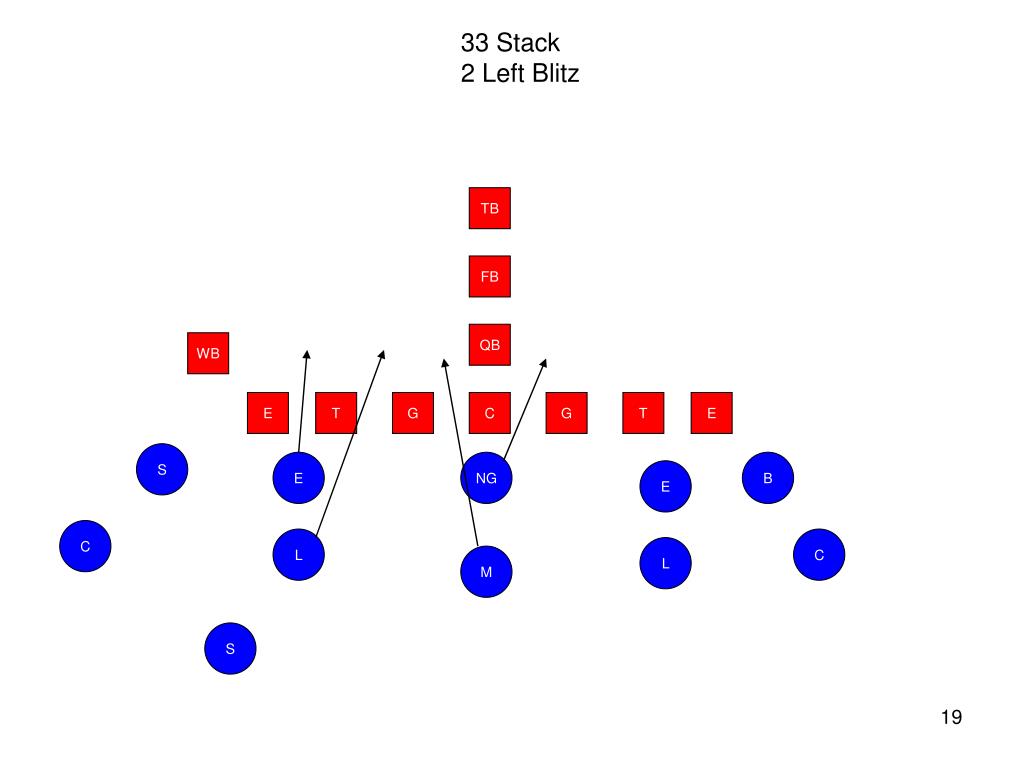 33 Stack 2 Left Blitz TB FB QB WB E T G C G T E S E NG B E C L C L M S