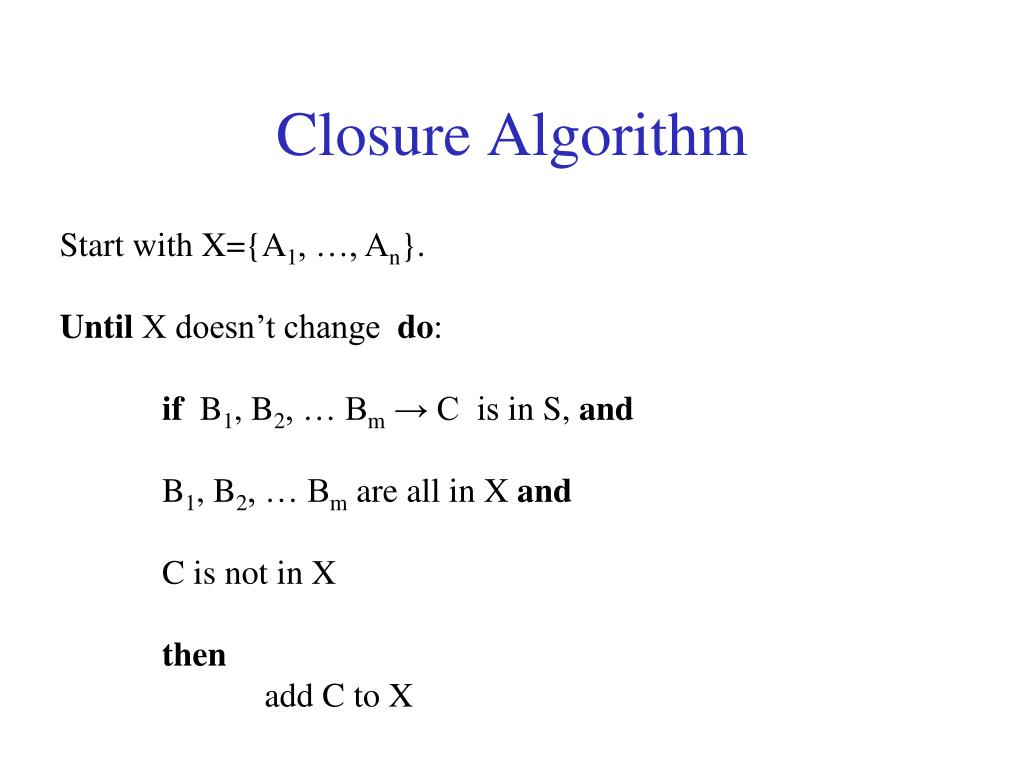 Closure Algorithm Start with X={A1, …, An}. UntilX doesn’t change do: if B1, B2, … Bm → C is in S, and B1, B2, … Bmare all in X and C is not in X then add C to X