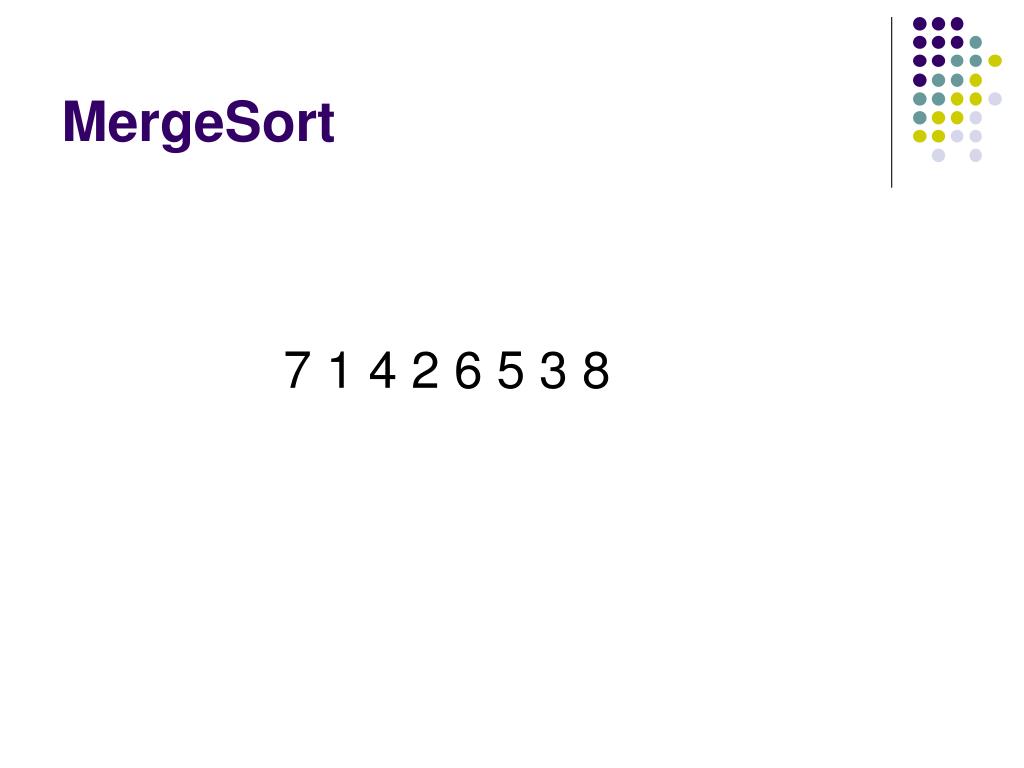 MergeSort: implementation 1 mergeSort(data) if data.length <= 1 return data else midpoint = data.length/2 left = left half of data right = right half of data leftSorted = mergeSort(left) rightSorted = mergeSort(right) return merge(leftSorted, rightSorted)