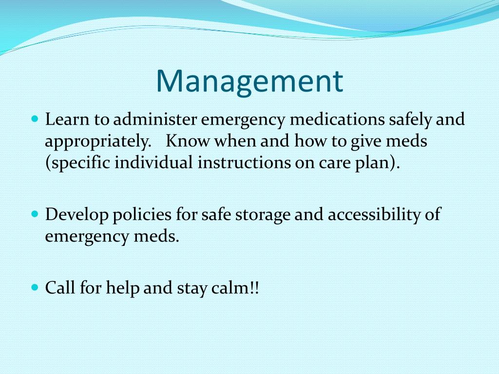 Management • Learn to administer emergency medications safely and appropriately. Know when and how to give meds (specific individual instructions on care plan). • Develop policies for safe storage and accessibility of emergency meds. • Call for help and stay calm!!