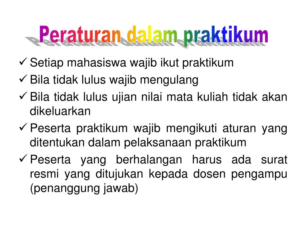 Peraturan dalam praktikum • Setiap mahasiswa wajib ikut praktikum • Bila tidak lulus wajib mengulang • Bila tidak lulus ujian nilai mata kuliah tidak akan dikeluarkan • Peserta praktikum wajib mengikuti aturan yang ditentukan dalam pelaksanaan praktikum • Peserta yang berhalangan harus ada surat resmi yang ditujukan kepada dosen pengampu (penanggung jawab)