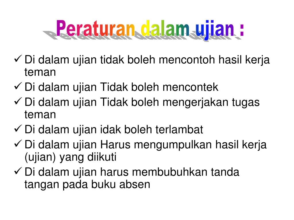 Peraturan dalam ujian : • Di dalam ujian tidak boleh mencontoh hasil kerja teman • Di dalam ujian Tidak boleh mencontek • Di dalam ujian Tidak boleh mengerjakan tugas teman • Di dalam ujian idak boleh terlambat • Di dalam ujian Harus mengumpulkan hasil kerja (ujian) yang diikuti • Di dalam ujian harus membubuhkan tanda tangan pada buku absen