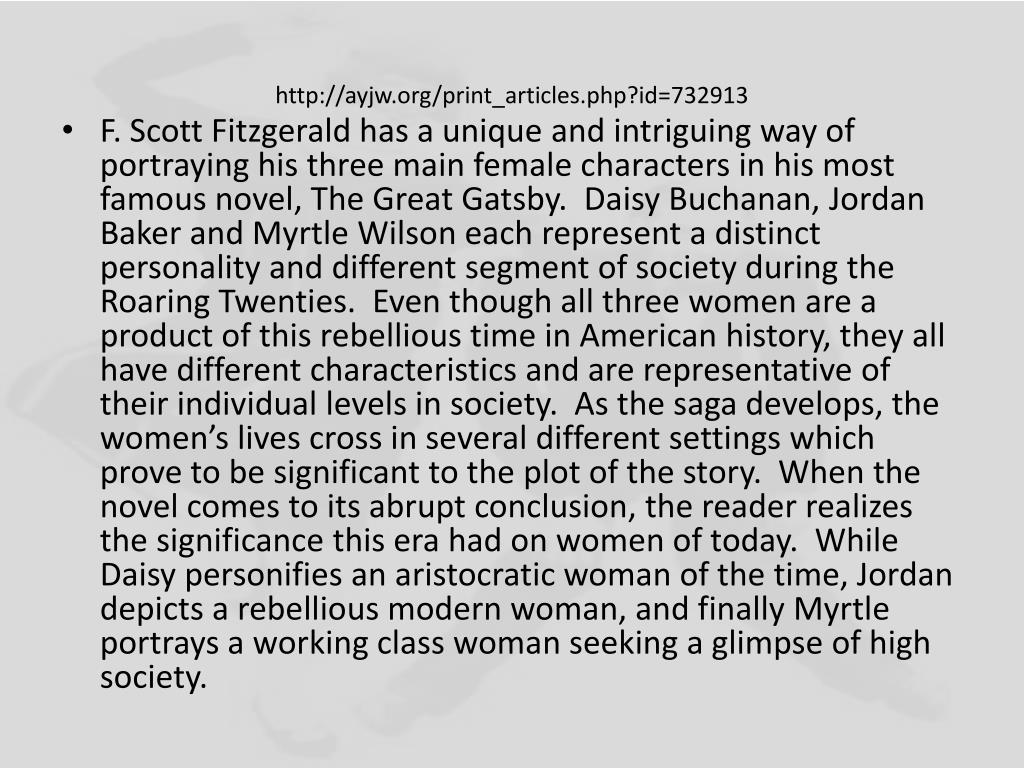 http://ayjw.org/print_articles.php?id=732913 • F. Scott Fitzgerald has a unique and intriguing way of portraying his three main female characters in his most famous novel, The Great Gatsby. Daisy Buchanan, Jordan Baker and Myrtle Wilson each represent a distinct personality and different segment of society during the Roaring Twenties. Even though all three women are a product of this rebellious time in American history, they all have different characteristics and are representative of their individual levels in society. As the saga develops, the women’s lives cross in several different settings which prove to be significant to the plot of the story. When the novel comes to its abrupt conclusion, the reader realizes the significance this era had on women of today. While Daisy personifies an aristocratic woman of the time, Jordan depicts a rebellious modern woman, and finally Myrtle portrays a working class woman seeking a glimpse of high society.
