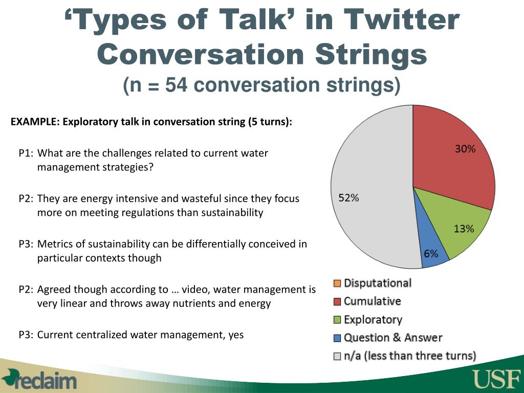‘Types of Talk’ in Twitter Conversation Strings(n = 54 conversation strings) EXAMPLE: Exploratory talk in conversation string (5 turns): P1: What are the challenges related to current water management strategies? P2: They are energy intensive and wasteful since they focus more on meeting regulations than sustainability P3: Metrics of sustainability can be differentially conceived in particular contexts though P2: Agreed though according to … video, water management is very linear and throws away nutrients and energy P3: Current centralized water management, yes