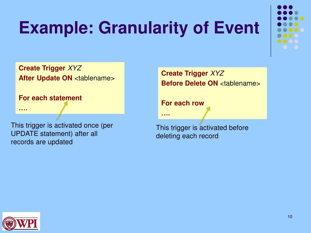Example: Granularity of Event Create Trigger XYZ After Update ON <tablename> For each statement …. Create Trigger XYZ Before Delete ON <tablename> For each row …. This trigger is activated once (per UPDATE statement) after all records are updated This trigger is activated before deleting each record