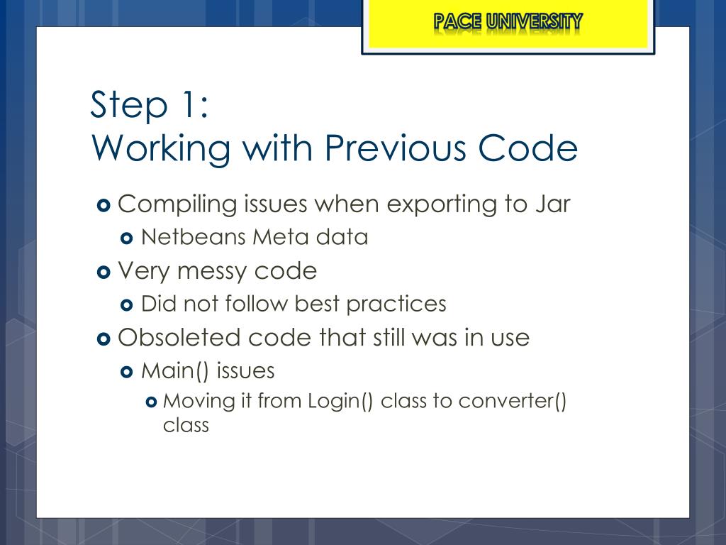 Pace University Pace University Step 1: Working with Previous Code • Compiling issues when exporting to Jar • Netbeans Meta data • Very messy code • Did not follow best practices • Obsoleted code that still was in use • Main() issues • Moving it from Login() class to converter() class